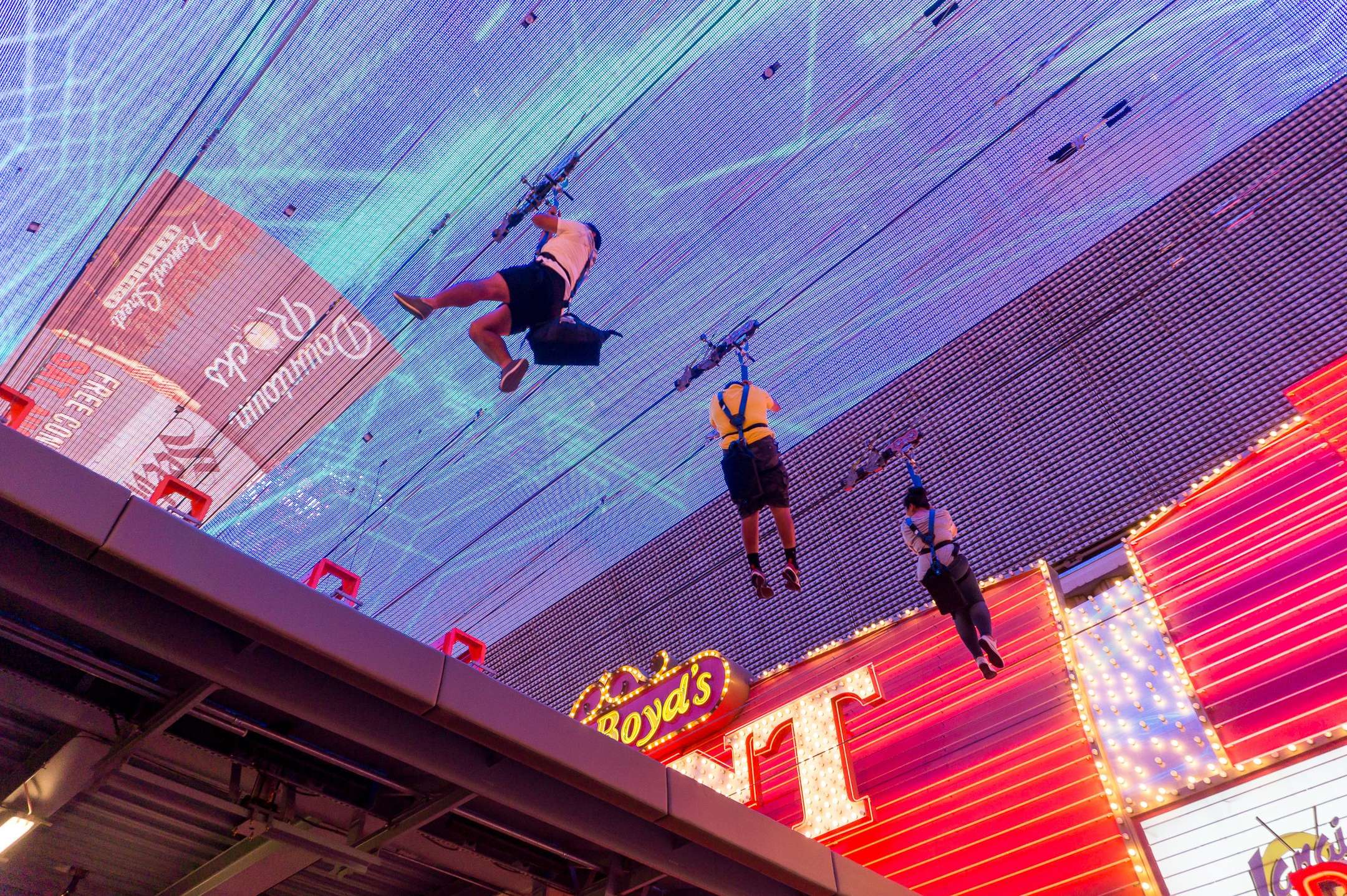 Under the new Viva Vision canopy, which extends 1,700 feet above the Fremont Street Experience, the upper Super-Hero Zoom (Zoomline) traverses the whole length of the attraction. You fly 850 feet in the lower Zip-Zilla (Zipline), which is half the length of the Fremont Street Experience.